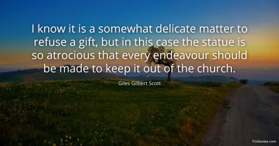 Scott, Giles Gilbert. (2026, January 16). I know it is a somewhat delicate matter to refuse a gift, but in this case the statue is so atrocious that every endeavour should be made to keep it out of the church. FixQuotes. https://fixquotes.com/quotes/i-know-it-is-a-somewhat-delicate-matter-to-refuse-122344/