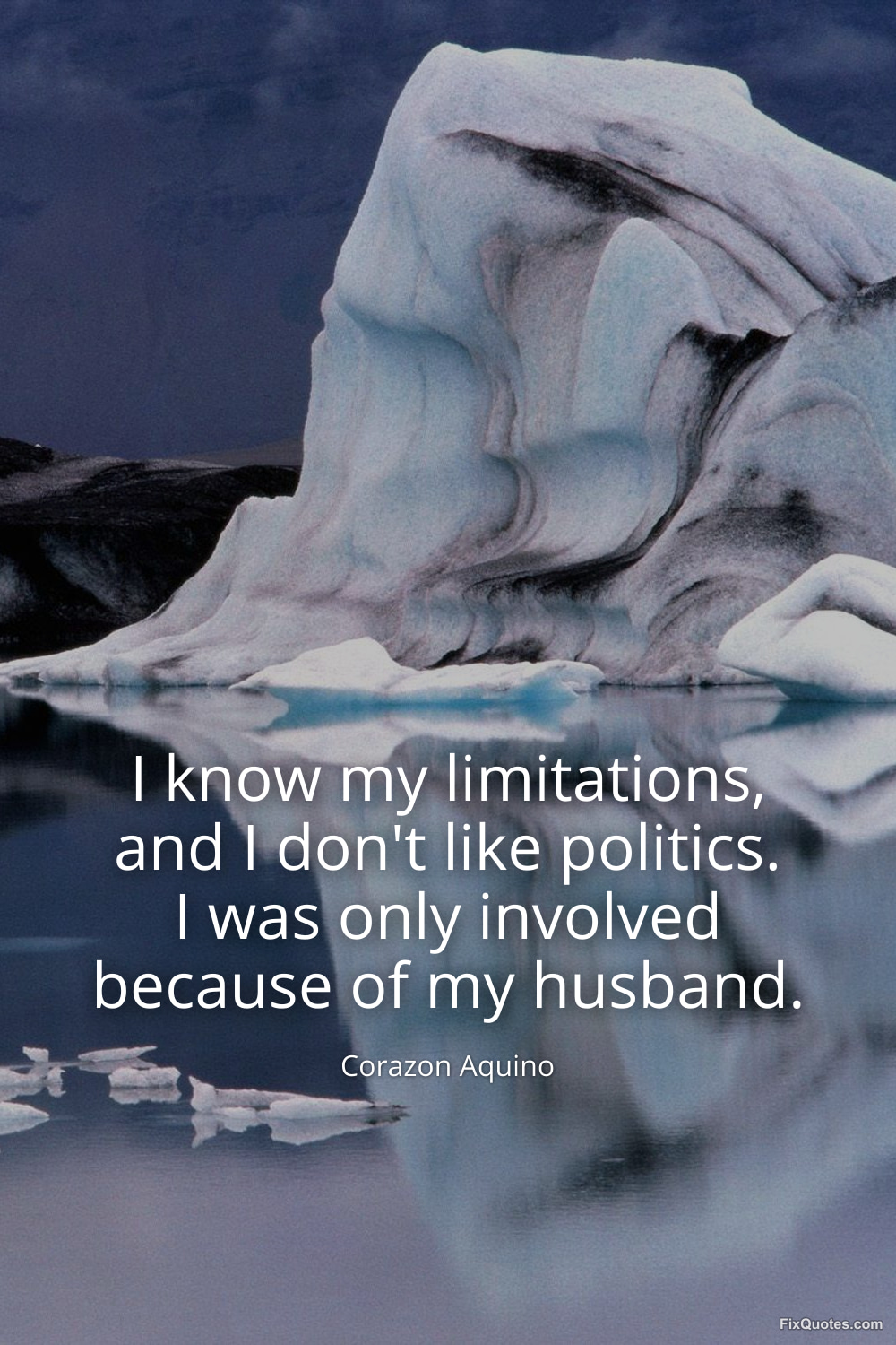 Aquino, Corazon. (2026, January 17). I know my limitations, and I don't like politics. I was only involved because of my husband. FixQuotes. https://fixquotes.com/quotes/i-know-my-limitations-and-i-dont-like-politics-i-38964/