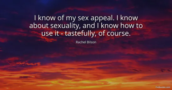 Bilson, Rachel. (2026, January 15). I know of my sex appeal. I know about sexuality, and I know how to use it - tastefully, of course. FixQuotes. https://fixquotes.com/quotes/i-know-of-my-sex-appeal-i-know-about-sexuality-159523/