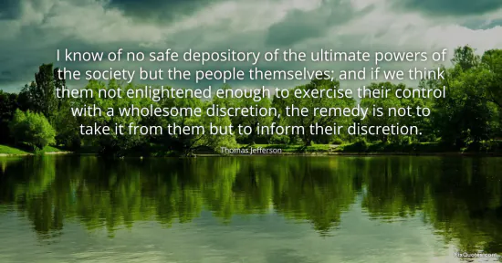 Jefferson, Thomas. "I know of no safe depository of the ultimate powers of the society but the people themselves; and if we think them not enlightened enough to exercise their control with a wholesome discretion, the remedy is not to take it from them but to inform their discretion." FixQuotes. January 17, 2026. https://fixquotes.com/quotes/i-know-of-no-safe-depository-of-the-ultimate-36791/.