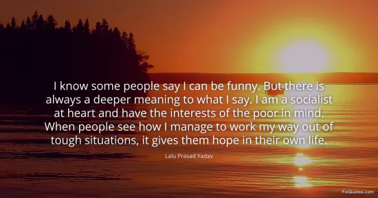 Yadav, Lalu Prasad. (2026, January 16). I know some people say I can be funny. But there is always a deeper meaning to what I say. I am a socialist at heart and have the interests of the poor in mind. When people see how I manage to work my way out of tough situations, it gives them hope in their own life. FixQuotes. https://fixquotes.com/quotes/i-know-some-people-say-i-can-be-funny-but-there-113883/