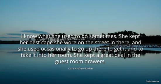 Borden, Lizzie Andrew. "I know what she used to do sometimes. She kept her best cape she wore on the street in there, and she used occasionally to go up there to get it and to take it into her room. She kept a great deal in the guest room drawers." FixQuotes. January 16, 2026. https://fixquotes.com/quotes/i-know-what-she-used-to-do-sometimes-she-kept-her-99244/.