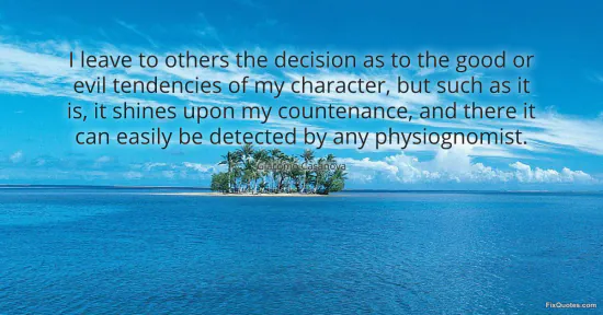 "I leave to others the decision as to the good or evil tendencies of my character, but such as it is, it shines upon my countenance, and there it can easily be detected by any physiognomist." FixQuotes, 20 Feb. 2026, https://fixquotes.com/quotes/i-leave-to-others-the-decision-as-to-the-good-or-4554/. Accessed 22 Feb. 2026.
