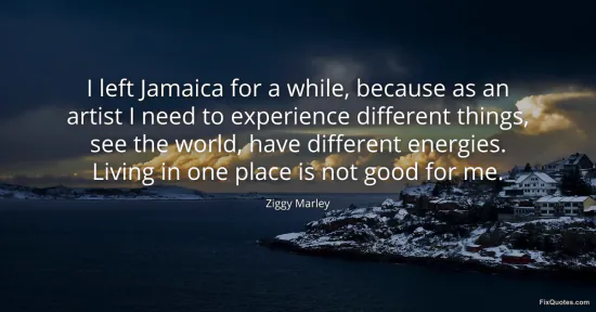 Marley, Ziggy. (2026, January 15). I left Jamaica for a while, because as an artist I need to experience different things, see the world, have different energies. Living in one place is not good for me. FixQuotes. https://fixquotes.com/quotes/i-left-jamaica-for-a-while-because-as-an-artist-i-160037/
