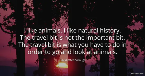 Attenborough, David. (2026, January 18). I like animals. I like natural history. The travel bit is not the important bit. The travel bit is what you have to do in order to go and look at animals. FixQuotes. https://fixquotes.com/quotes/i-like-animals-i-like-natural-history-the-travel-14377/