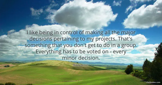 Brown, Bobby. "I like being in control of making all the major decisions pertaining to my projects. That's something that you don't get to do in a group. Everything has to be voted on - every minor decision." FixQuotes. January 15, 2026. https://fixquotes.com/quotes/i-like-being-in-control-of-making-all-the-major-170900/.