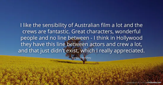 Hershey, Barbara. (2026, January 17). I like the sensibility of Australian film a lot and the crews are fantastic. Great characters, wonderful people and no line between - I think in Hollywood they have this line between actors and crew a lot, and that just didn't exist, which I really appreciated. FixQuotes. https://fixquotes.com/quotes/i-like-the-sensibility-of-australian-film-a-lot-64035/