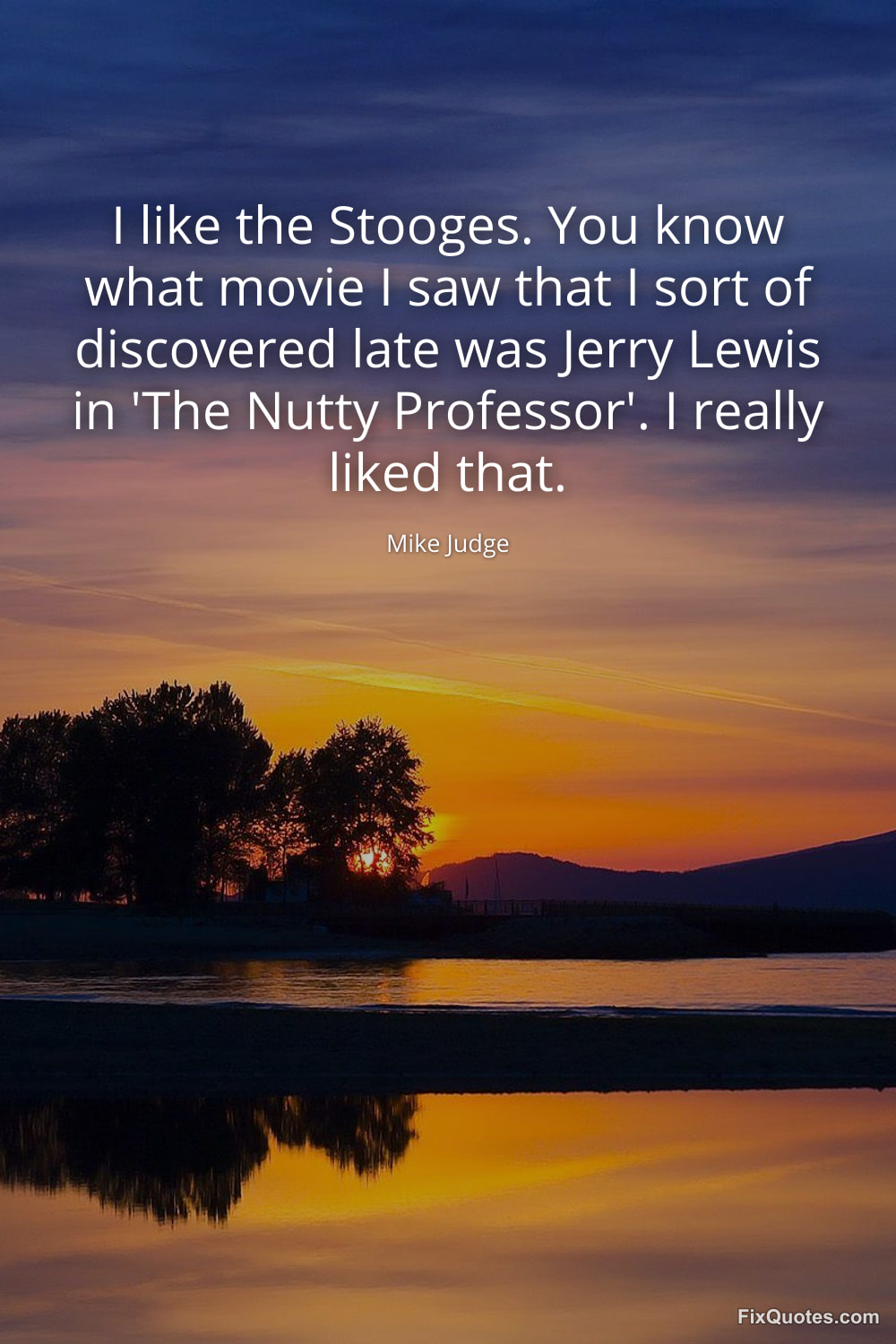 Judge, Mike. (2026, January 16). I like the Stooges. You know what movie I saw that I sort of discovered late was Jerry Lewis in 'The Nutty Professor'. I really liked that. FixQuotes. https://fixquotes.com/quotes/i-like-the-stooges-you-know-what-movie-i-saw-that-114686/