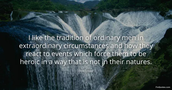 Lowe, Rob. (2026, January 17). I like the tradition of ordinary men in extraordinary circumstances and how they react to events which force them to be heroic in a way that is not in their natures. FixQuotes. https://fixquotes.com/quotes/i-like-the-tradition-of-ordinary-men-in-81367/