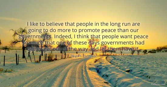 Eisenhower, Dwight D. (2026, January 18). I like to believe that people in the long run are going to do more to promote peace than our governments. Indeed, I think that people want peace so much that one of these days governments had better get out of the way and let them have it. FixQuotes. https://fixquotes.com/quotes/i-like-to-believe-that-people-in-the-long-run-are-16929/
