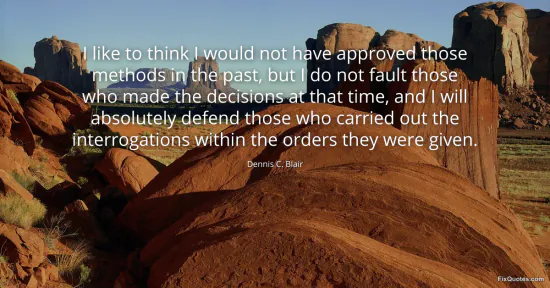 Blair, Dennis C. "I like to think I would not have approved those methods in the past, but I do not fault those who made the decisions at that time, and I will absolutely defend those who carried out the interrogations within the orders they were given." FixQuotes. January 17, 2026. https://fixquotes.com/quotes/i-like-to-think-i-would-not-have-approved-those-60567/.