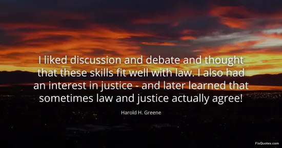 Greene, Harold H. (2026, January 17). I liked discussion and debate and thought that these skills fit well with law. I also had an interest in justice - and later learned that sometimes law and justice actually agree! FixQuotes. https://fixquotes.com/quotes/i-liked-discussion-and-debate-and-thought-that-59464/