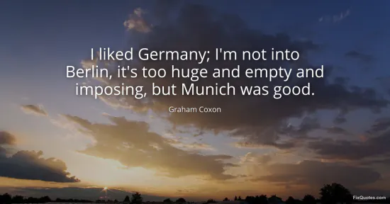 Coxon, Graham. (2026, January 15). I liked Germany; I'm not into Berlin, it's too huge and empty and imposing, but Munich was good. FixQuotes. https://fixquotes.com/quotes/i-liked-germany-im-not-into-berlin-its-too-huge-142433/