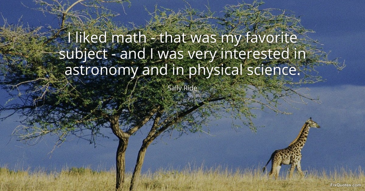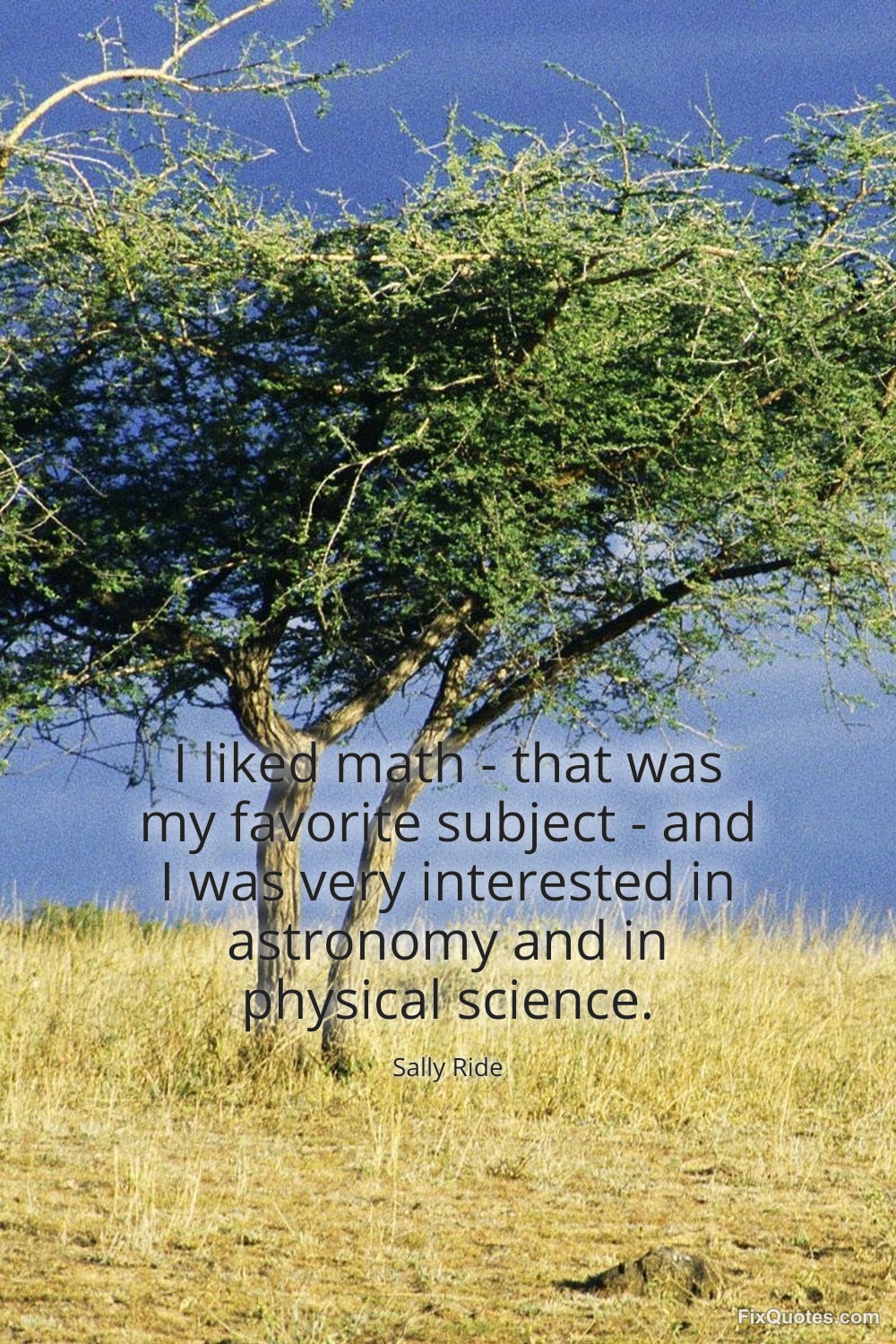 Ride, Sally. (2026, January 18). I liked math - that was my favorite subject - and I was very interested in astronomy and in physical science. FixQuotes. https://fixquotes.com/quotes/i-liked-math-that-was-my-favorite-subject-and-20663/