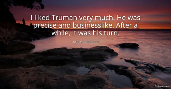 Mountbatten, Lord. "I liked Truman very much. He was precise and businesslike. After a while, it was his turn." FixQuotes. January 15, 2026. https://fixquotes.com/quotes/i-liked-truman-very-much-he-was-precise-and-165395/.