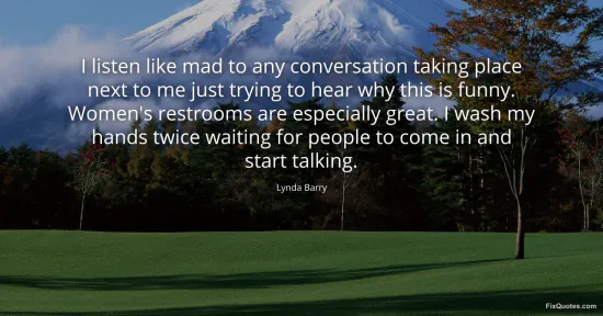 Barry, Lynda. (2026, January 16). I listen like mad to any conversation taking place next to me just trying to hear why this is funny. Women's restrooms are especially great. I wash my hands twice waiting for people to come in and start talking. FixQuotes. https://fixquotes.com/quotes/i-listen-like-mad-to-any-conversation-taking-131284/