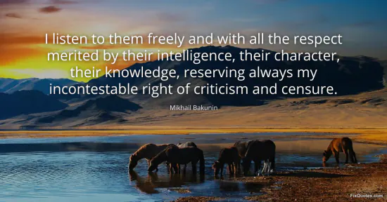 Bakunin, Mikhail. (2026, January 18). I listen to them freely and with all the respect merited by their intelligence, their character, their knowledge, reserving always my incontestable right of criticism and censure. FixQuotes. https://fixquotes.com/quotes/i-listen-to-them-freely-and-with-all-the-respect-16470/