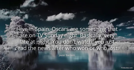 Bardem, Javier. (2026, January 15). I live in Spain. Oscars are something that are on TV Sunday night. Basically, very late at night. You don't watch, you just read the news after who won or who lost. FixQuotes. https://fixquotes.com/quotes/i-live-in-spain-oscars-are-something-that-are-on-164878/
