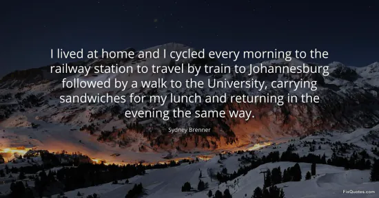 Brenner, Sydney. "I lived at home and I cycled every morning to the railway station to travel by train to Johannesburg followed by a walk to the University, carrying sandwiches for my lunch and returning in the evening the same way." FixQuotes. January 16, 2026. https://fixquotes.com/quotes/i-lived-at-home-and-i-cycled-every-morning-to-the-110549/.