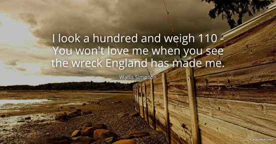 Simpson, Wallis. (2026, February 20). I look a hundred and weigh 110 - You won't love me when you see the wreck England has made me. FixQuotes. https://fixquotes.com/quotes/i-look-a-hundred-and-weigh-110-you-wont-love-me-18721/