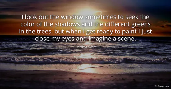Moses, Grandma. (2026, January 16). I look out the window sometimes to seek the color of the shadows and the different greens in the trees, but when I get ready to paint I just close my eyes and imagine a scene. FixQuotes. https://fixquotes.com/quotes/i-look-out-the-window-sometimes-to-seek-the-color-112421/