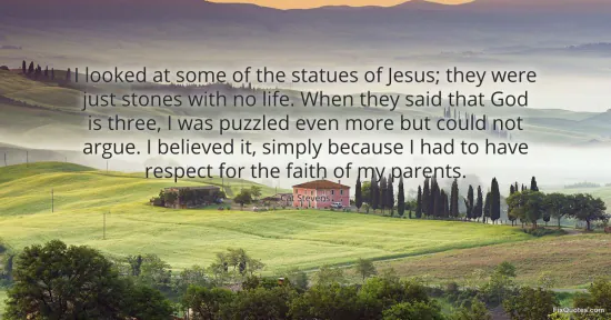 "I looked at some of the statues of Jesus; they were just stones with no life. When they said that God is three, I was puzzled even more but could not argue. I believed it, simply because I had to have respect for the faith of my parents." FixQuotes, 18 Jan. 2026, https://fixquotes.com/quotes/i-looked-at-some-of-the-statues-of-jesus-they-7091/. Accessed 12 Feb. 2026.