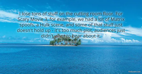 "I lose tons of stuff on the cutting room floor. For Scary Movie 3, for example, we had a lot of Matrix spoofs, a Hulk scene, and some of that stuff just doesn't hold up - it's too much plot, audiences just didn't want to hear about it." FixQuotes, 15 Jan. 2026, https://fixquotes.com/quotes/i-lose-tons-of-stuff-on-the-cutting-room-floor-158100/. Accessed 12 Feb. 2026.