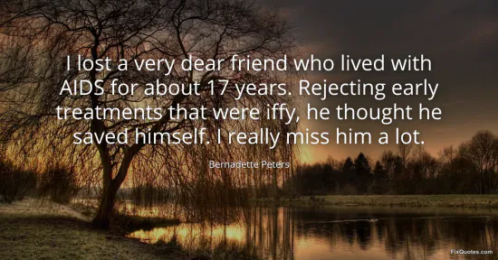 Peters, Bernadette. "I lost a very dear friend who lived with AIDS for about 17 years. Rejecting early treatments that were iffy, he thought he saved himself. I really miss him a lot." FixQuotes. January 18, 2026. https://fixquotes.com/quotes/i-lost-a-very-dear-friend-who-lived-with-aids-for-2564/.