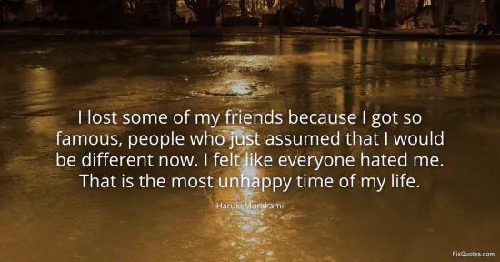 Murakami, Haruki. "I lost some of my friends because I got so famous, people who just assumed that I would be different now. I felt like everyone hated me. That is the most unhappy time of my life." FixQuotes. January 16, 2026. https://fixquotes.com/quotes/i-lost-some-of-my-friends-because-i-got-so-famous-117500/.