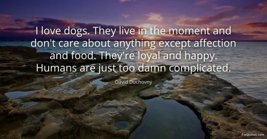 Duchovny, David. (2026, January 17). I love dogs. They live in the moment and don't care about anything except affection and food. They're loyal and happy. Humans are just too damn complicated. FixQuotes. https://fixquotes.com/quotes/i-love-dogs-they-live-in-the-moment-and-dont-care-41005/