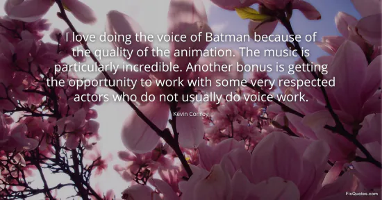 Conroy, Kevin. "I love doing the voice of Batman because of the quality of the animation. The music is particularly incredible. Another bonus is getting the opportunity to work with some very respected actors who do not usually do voice work." FixQuotes. January 16, 2026. https://fixquotes.com/quotes/i-love-doing-the-voice-of-batman-because-of-the-86506/.