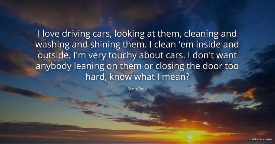 Baio, Scott. (2026, January 16). I love driving cars, looking at them, cleaning and washing and shining them. I clean 'em inside and outside. I'm very touchy about cars. I don't want anybody leaning on them or closing the door too hard, know what I mean? FixQuotes. https://fixquotes.com/quotes/i-love-driving-cars-looking-at-them-cleaning-and-84260/