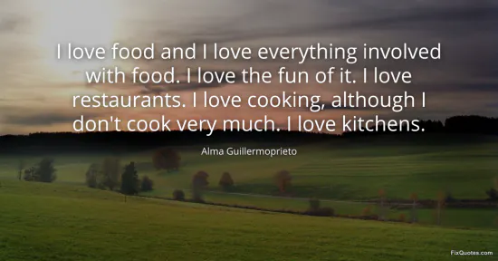 Guillermoprieto, Alma. "I love food and I love everything involved with food. I love the fun of it. I love restaurants. I love cooking, although I don't cook very much. I love kitchens." FixQuotes. January 16, 2026. https://fixquotes.com/quotes/i-love-food-and-i-love-everything-involved-with-122363/.