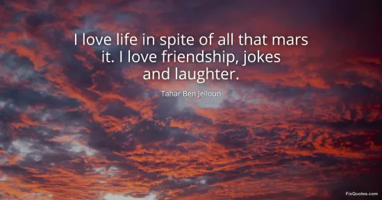 Jelloun, Tahar Ben. (2026, January 15). I love life in spite of all that mars it. I love friendship, jokes and laughter. FixQuotes. https://fixquotes.com/quotes/i-love-life-in-spite-of-all-that-mars-it-i-love-165875/
