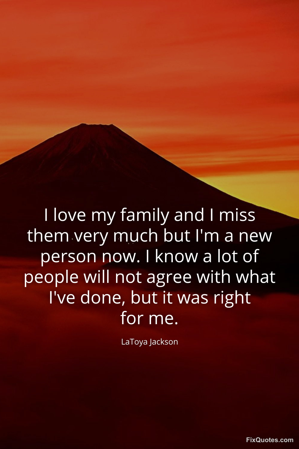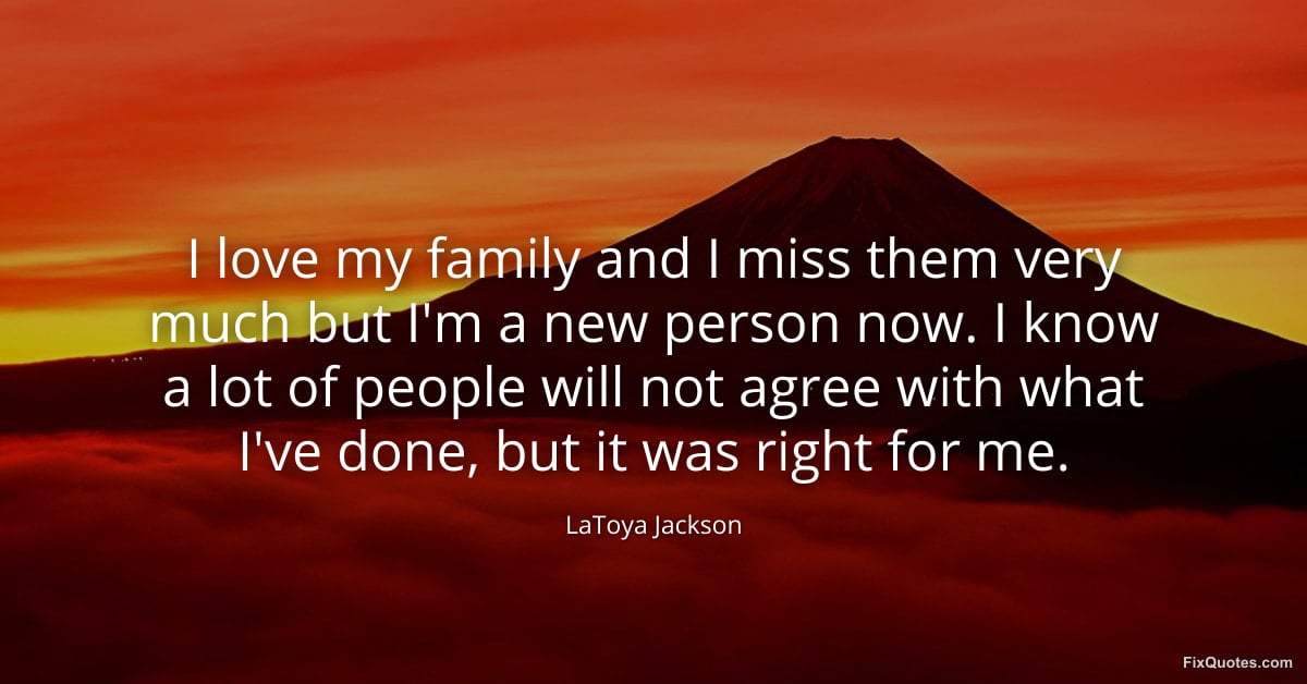 Jackson, LaToya. "I love my family and I miss them very much but I'm a new person now. I know a lot of people will not agree with what I've done, but it was right for me." FixQuotes. January 17, 2026. https://fixquotes.com/quotes/i-love-my-family-and-i-miss-them-very-much-but-im-81261/.