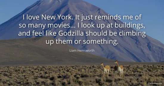 Hemsworth, Liam. (2026, January 15). I love New York. It just reminds me of so many movies... I look up at buildings, and feel like Godzilla should be climbing up them or something. FixQuotes. https://fixquotes.com/quotes/i-love-new-york-it-just-reminds-me-of-so-many-172478/