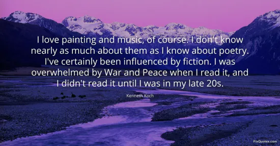 Koch, Kenneth. "I love painting and music, of course. I don't know nearly as much about them as I know about poetry. I've certainly been influenced by fiction. I was overwhelmed by War and Peace when I read it, and I didn't read it until I was in my late 20s." FixQuotes. January 16, 2026. https://fixquotes.com/quotes/i-love-painting-and-music-of-course-i-dont-know-84308/.