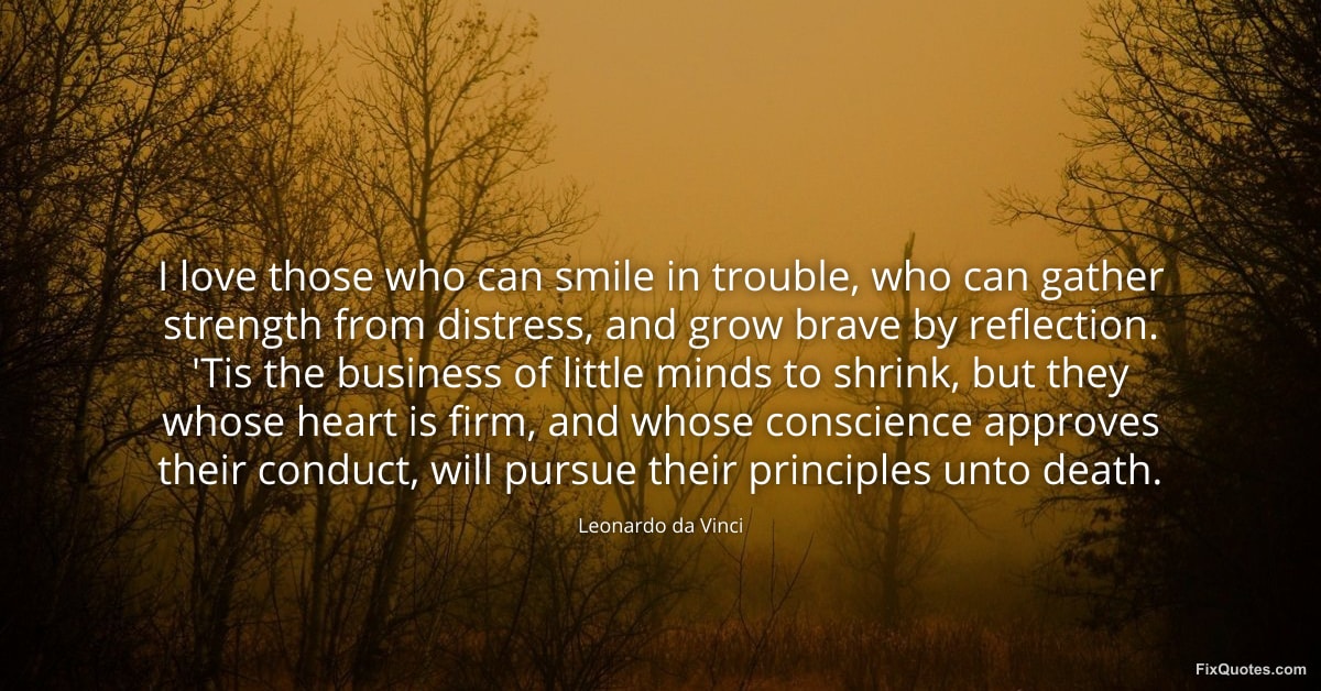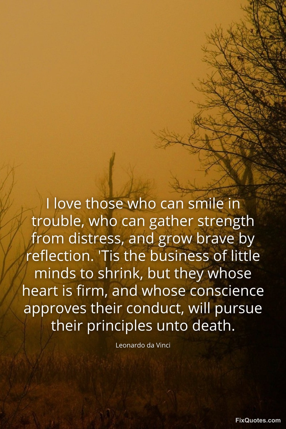 Vinci, Leonardo da. (2026, January 18). I love those who can smile in trouble, who can gather strength from distress, and grow brave by reflection. 'Tis the business of little minds to shrink, but they whose heart is firm, and whose conscience approves their conduct, will pursue their principles unto death. FixQuotes. https://fixquotes.com/quotes/i-love-those-who-can-smile-in-trouble-who-can-22374/