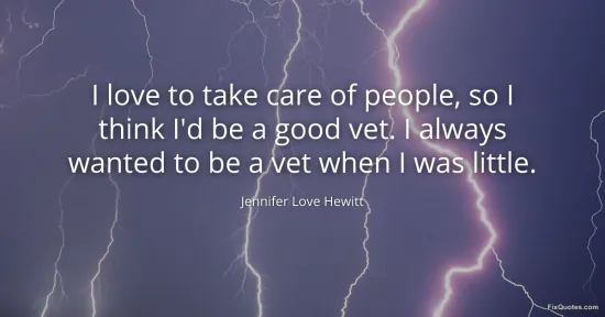 Hewitt, Jennifer Love. "I love to take care of people, so I think I'd be a good vet. I always wanted to be a vet when I was little." FixQuotes. January 16, 2026. https://fixquotes.com/quotes/i-love-to-take-care-of-people-so-i-think-id-be-a-126010/.