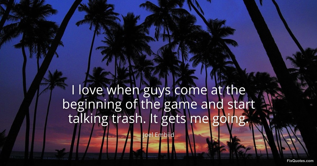 Embiid, Joel. (2026, January 30). I love when guys come at the beginning of the game and start talking trash. It gets me going. FixQuotes. https://fixquotes.com/quotes/i-love-when-guys-come-at-the-beginning-of-the-184810/