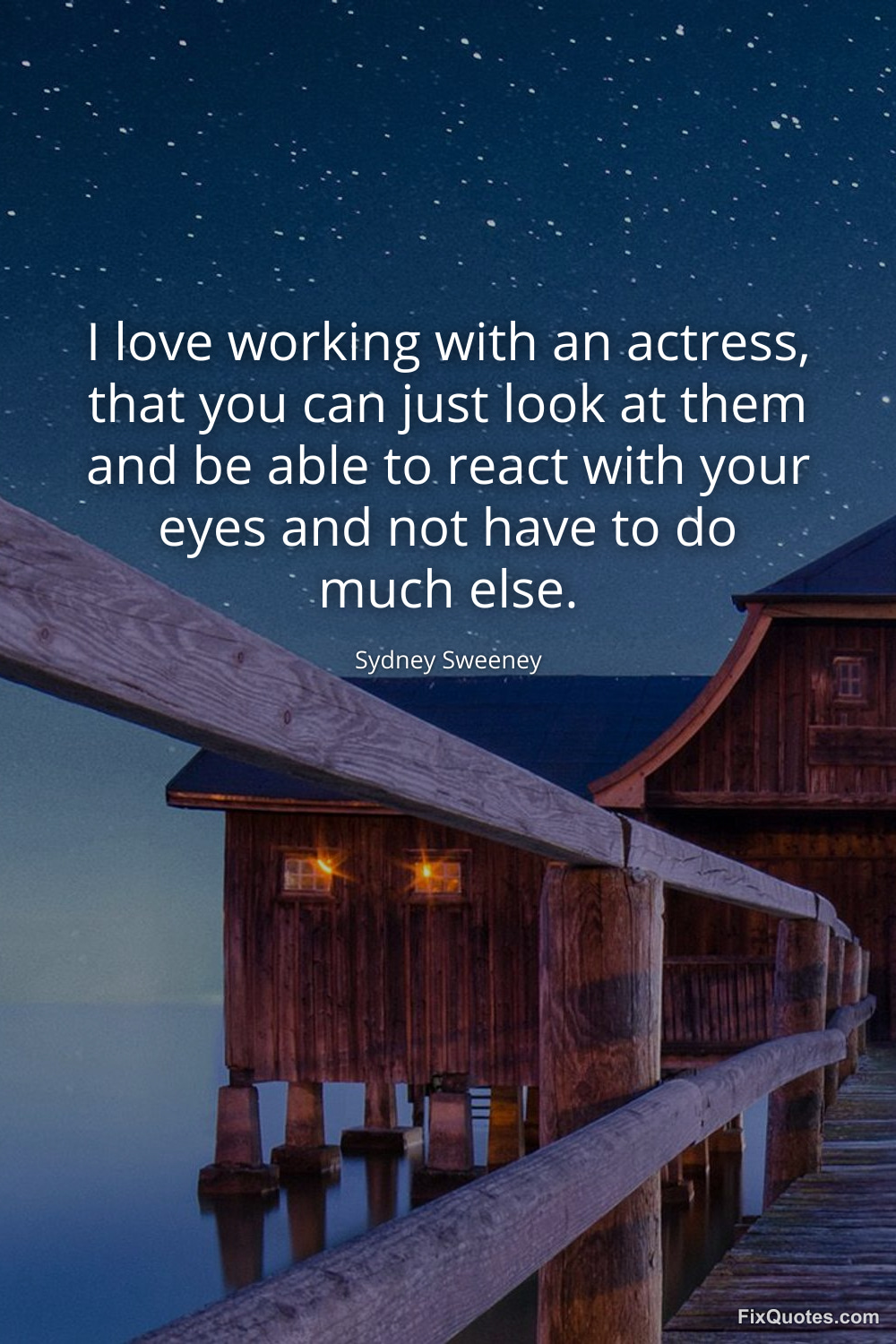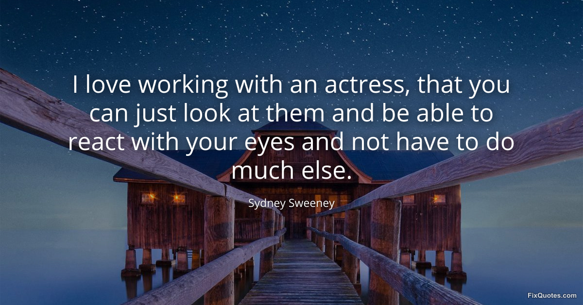 Sweeney, Sydney. (2026, February 17). I love working with an actress, that you can just look at them and be able to react with your eyes and not have to do much else. FixQuotes. https://fixquotes.com/quotes/i-love-working-with-an-actress-that-you-can-just-183766/