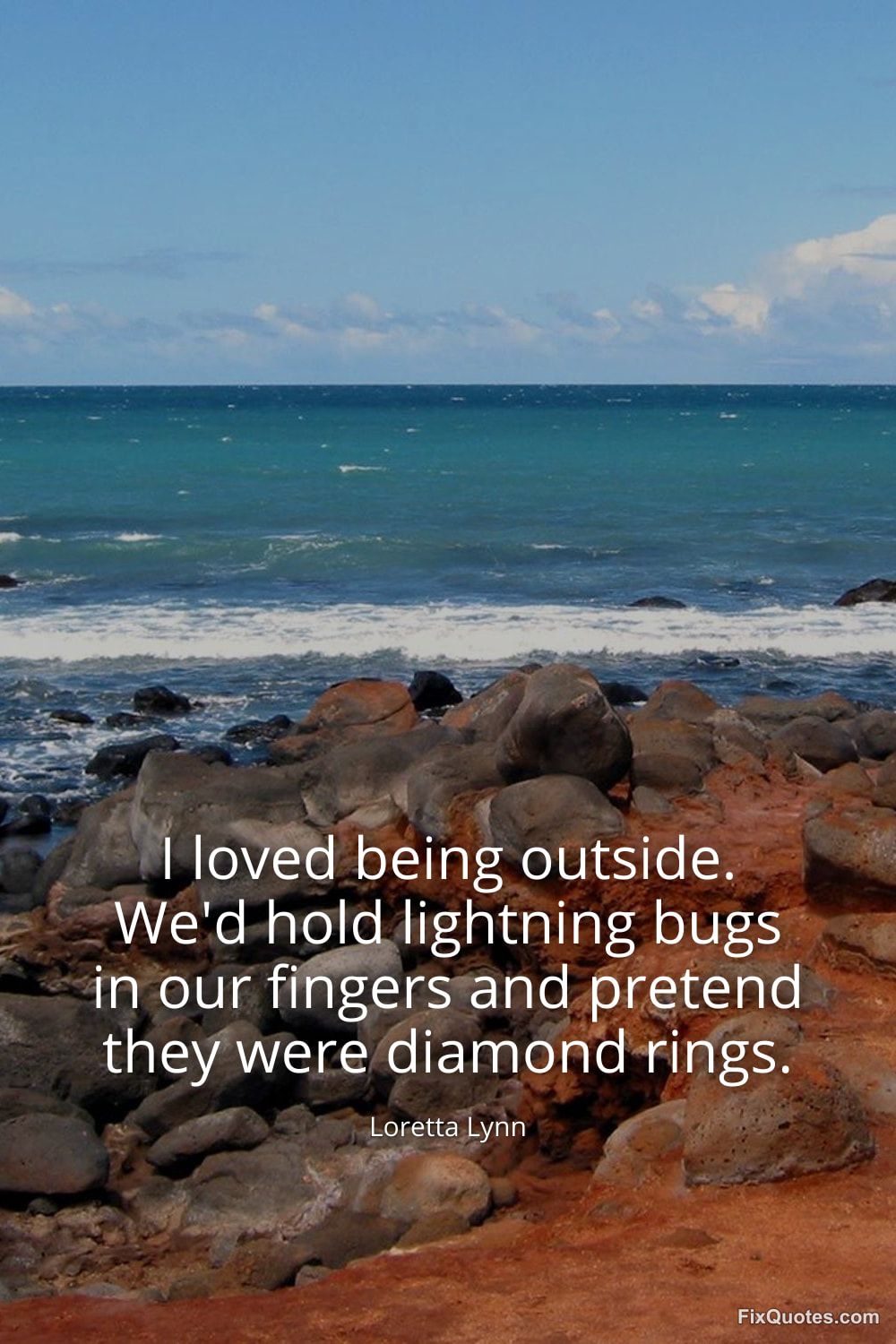 Lynn, Loretta. (2026, January 17). I loved being outside. We'd hold lightning bugs in our fingers and pretend they were diamond rings. FixQuotes. https://fixquotes.com/quotes/i-loved-being-outside-wed-hold-lightning-bugs-in-69218/