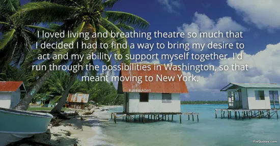 Allen, Karen. (2026, January 15). I loved living and breathing theatre so much that I decided I had to find a way to bring my desire to act and my ability to support myself together. I'd run through the possibilities in Washington, so that meant moving to New York. FixQuotes. https://fixquotes.com/quotes/i-loved-living-and-breathing-theatre-so-much-that-167878/