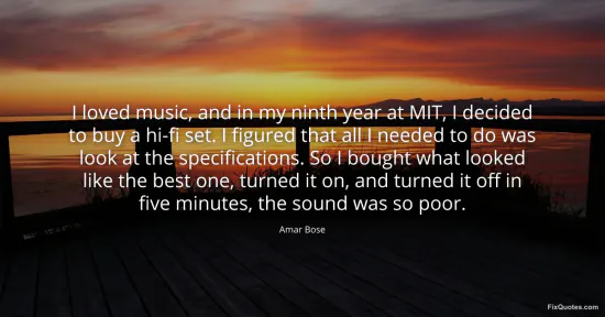 Bose, Amar. "I loved music, and in my ninth year at MIT, I decided to buy a hi-fi set. I figured that all I needed to do was look at the specifications. So I bought what looked like the best one, turned it on, and turned it off in five minutes, the sound was so poor." FixQuotes. January 18, 2026. https://fixquotes.com/quotes/i-loved-music-and-in-my-ninth-year-at-mit-i-9716/.