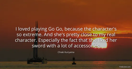 Kuriyama, Chiaki. "I loved playing Go Go, because the character's so extreme. And she's pretty close to my real character. Especially the fact that she liked her sword with a lot of accessories." FixQuotes. January 15, 2026. https://fixquotes.com/quotes/i-loved-playing-go-go-because-the-characters-so-157985/.
