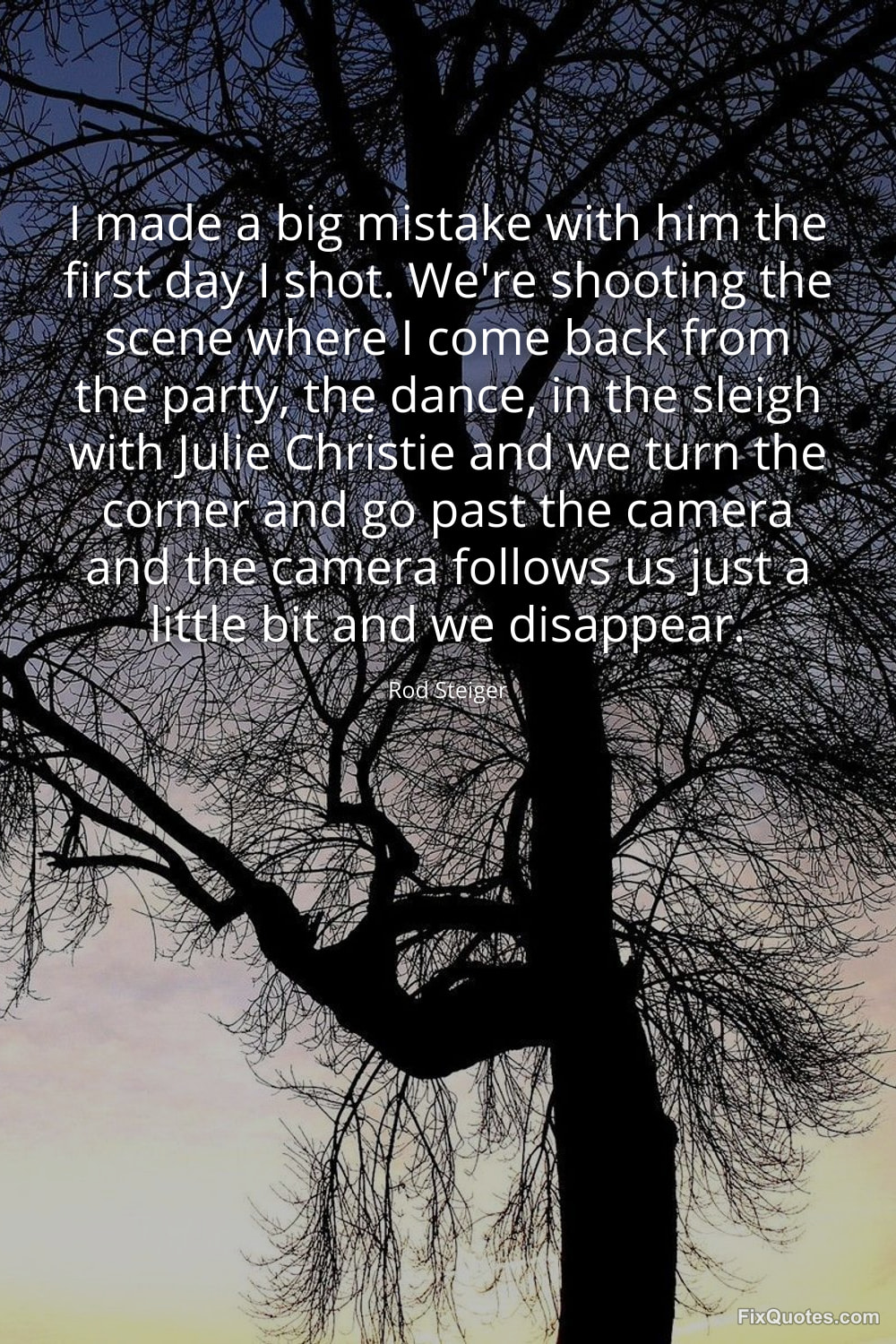 Steiger, Rod. (2026, January 15). I made a big mistake with him the first day I shot. We're shooting the scene where I come back from the party, the dance, in the sleigh with Julie Christie and we turn the corner and go past the camera and the camera follows us just a little bit and we disappear. FixQuotes. https://fixquotes.com/quotes/i-made-a-big-mistake-with-him-the-first-day-i-149978/