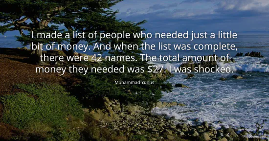 Yunus, Muhammad. (2026, January 15). I made a list of people who needed just a little bit of money. And when the list was complete, there were 42 names. The total amount of money they needed was $27. I was shocked. FixQuotes. https://fixquotes.com/quotes/i-made-a-list-of-people-who-needed-just-a-little-153020/