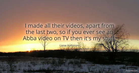 Hallstrom, Lasse. "I made all their videos, apart from the last two, so if you ever see an Abba video on TV then it's my stuff." FixQuotes. January 17, 2026. https://fixquotes.com/quotes/i-made-all-their-videos-apart-from-the-last-two-72257/.