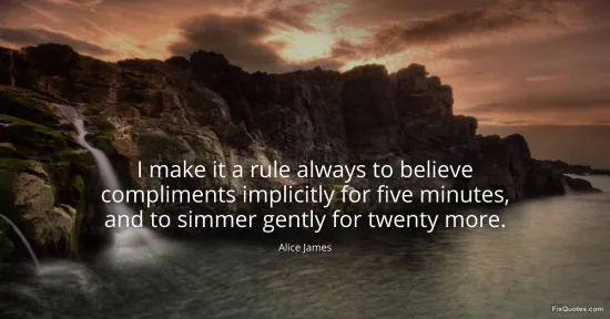 James, Alice. (2026, January 17). I make it a rule always to believe compliments implicitly for five minutes, and to simmer gently for twenty more. FixQuotes. https://fixquotes.com/quotes/i-make-it-a-rule-always-to-believe-compliments-35843/