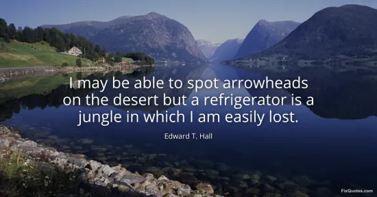 Hall, Edward T. "I may be able to spot arrowheads on the desert but a refrigerator is a jungle in which I am easily lost." FixQuotes. January 16, 2026. https://fixquotes.com/quotes/i-may-be-able-to-spot-arrowheads-on-the-desert-131555/.